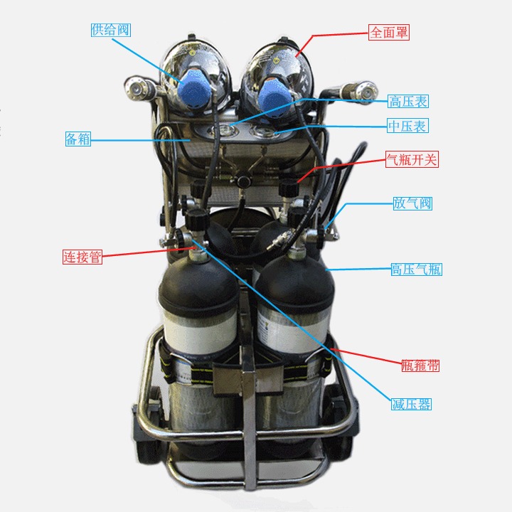 2.移動(dòng)氣源通過(guò)腰間閥和逃生氣瓶組合,正常情況下會(huì)直接使用移動(dòng)氣源的空氣。如果發(fā)生突發(fā)狀況,需要工作人員立馬撤離現(xiàn)場(chǎng)并打開(kāi)逃生氣閥,向安全區(qū)域撤離!