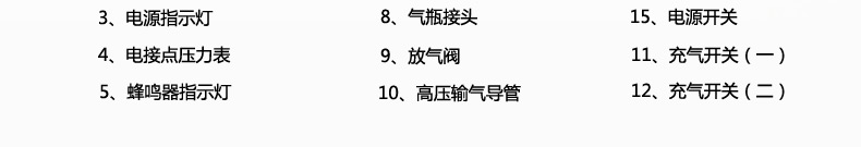 備件 1、外接充氣管(1根) 2、"O"型圈(18*2.4)10個 3、"O"型圈(12*1.9)5個 4、壓力表表墊1個 5、氣瓶轉(zhuǎn)換接頭(G5/8轉(zhuǎn)M22*1.5)1件