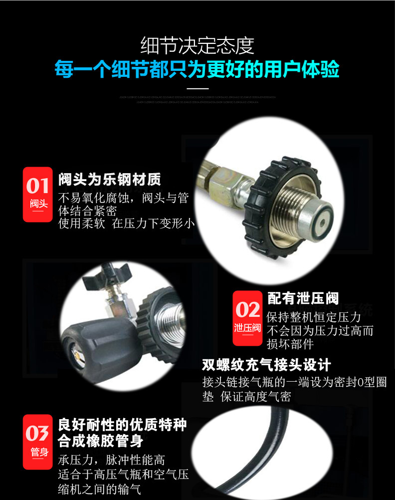 膠管承壓力高,脈沖性能優(yōu)越,非常適合作為高壓氣瓶和空氣壓縮機(jī)之間的輸氣通路使用